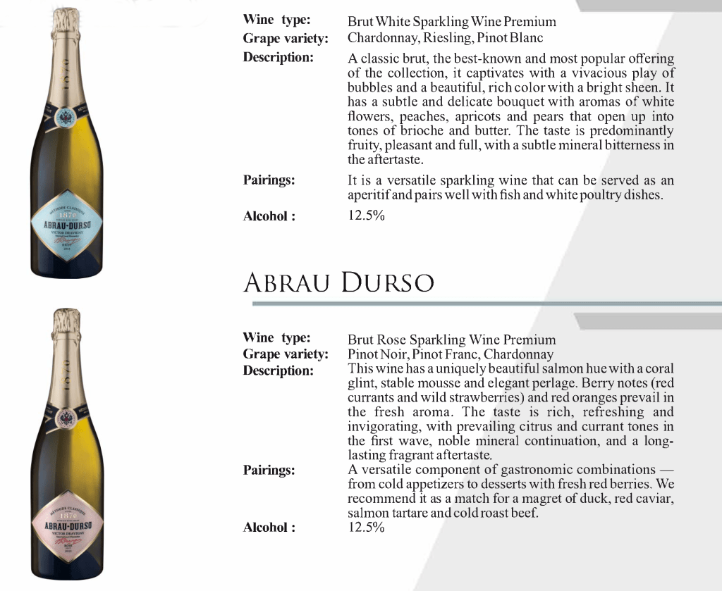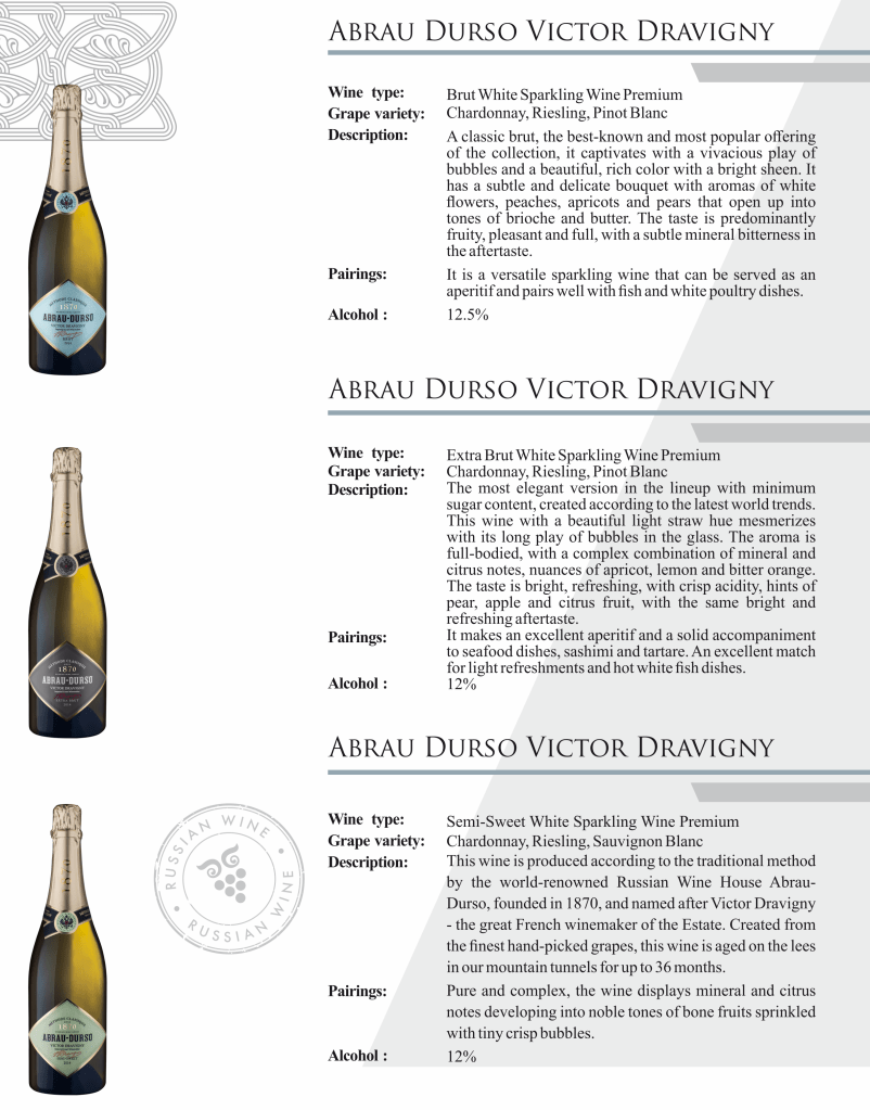 The premium personalized collection is named in honor of Victor Dravigny – the great French winemaker of the Abrau-Durso Estate in the early 20th century. This elegant aged sparkling wine is made with hand-harvested grapes originating from the best sites of Abrau-Durso by secondary fermentation within the bottle and ageing on the lees in Estates own mountain tunnels from nine to 36 months.