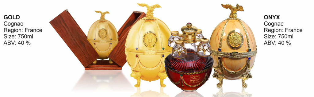The unique Faberge eggs-styled cases inspired by works of Karl Faberge are the true masterpieces of Imperial Collection brand. Each case is made of 24K gold plated metal alloy, covered with enamel of different colors and decorated with gilded elements and colored crystals. The decanters are made at the old Italian factory founded in the XII century, where the secrets of production of famous Venetian glass are transmitted from one generation to another. The decanter is decorated with pure gold and has a gilded cap with a red Swarovski crystal on top. The composition is completed with an elegant golden eagle, which was designed by one of the most famous Florentine masters, who works in Vatican for over thirty years.